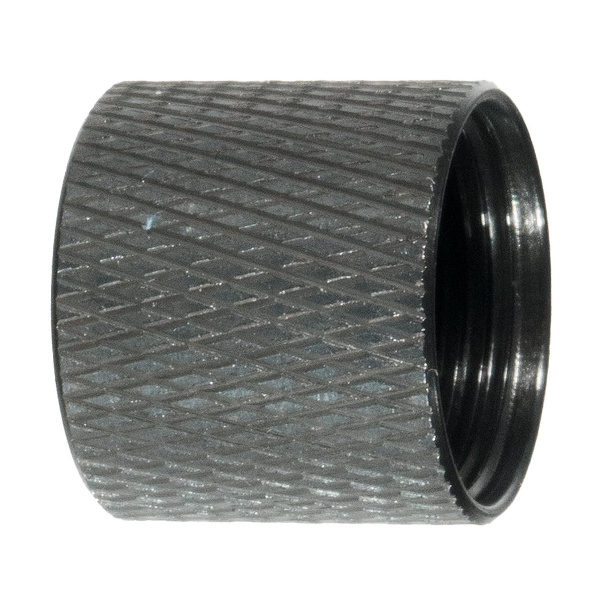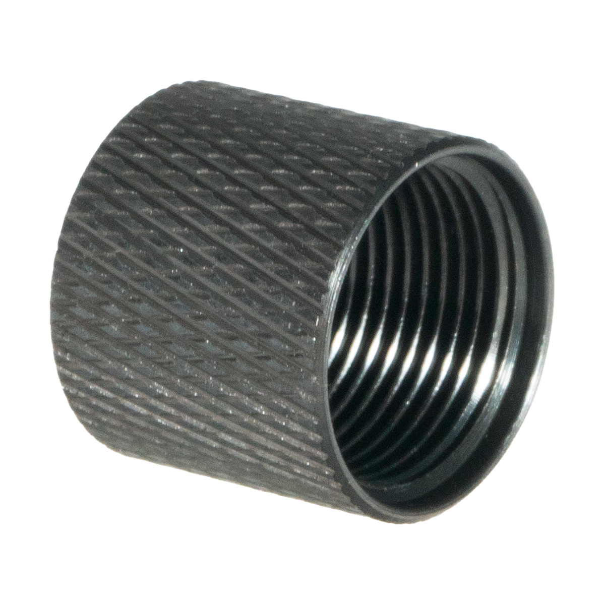 The black carbon steel material provides durability for repeated installation and removal. The construction resists wear from threading cycles and offers corrosion resistance in rugged conditions. The material protects barrel threads from external contact.