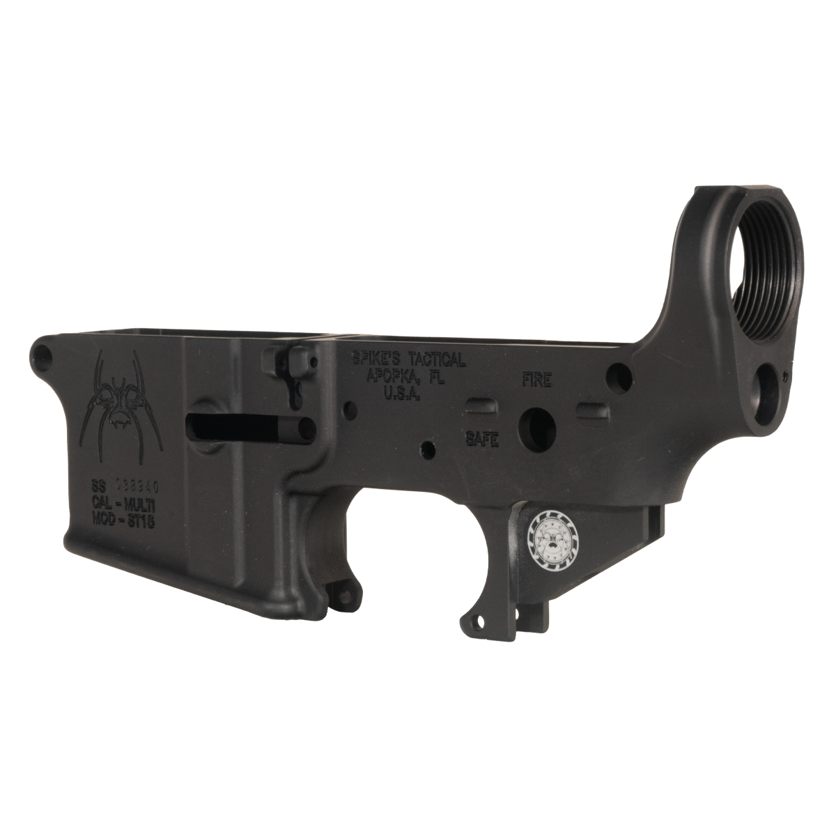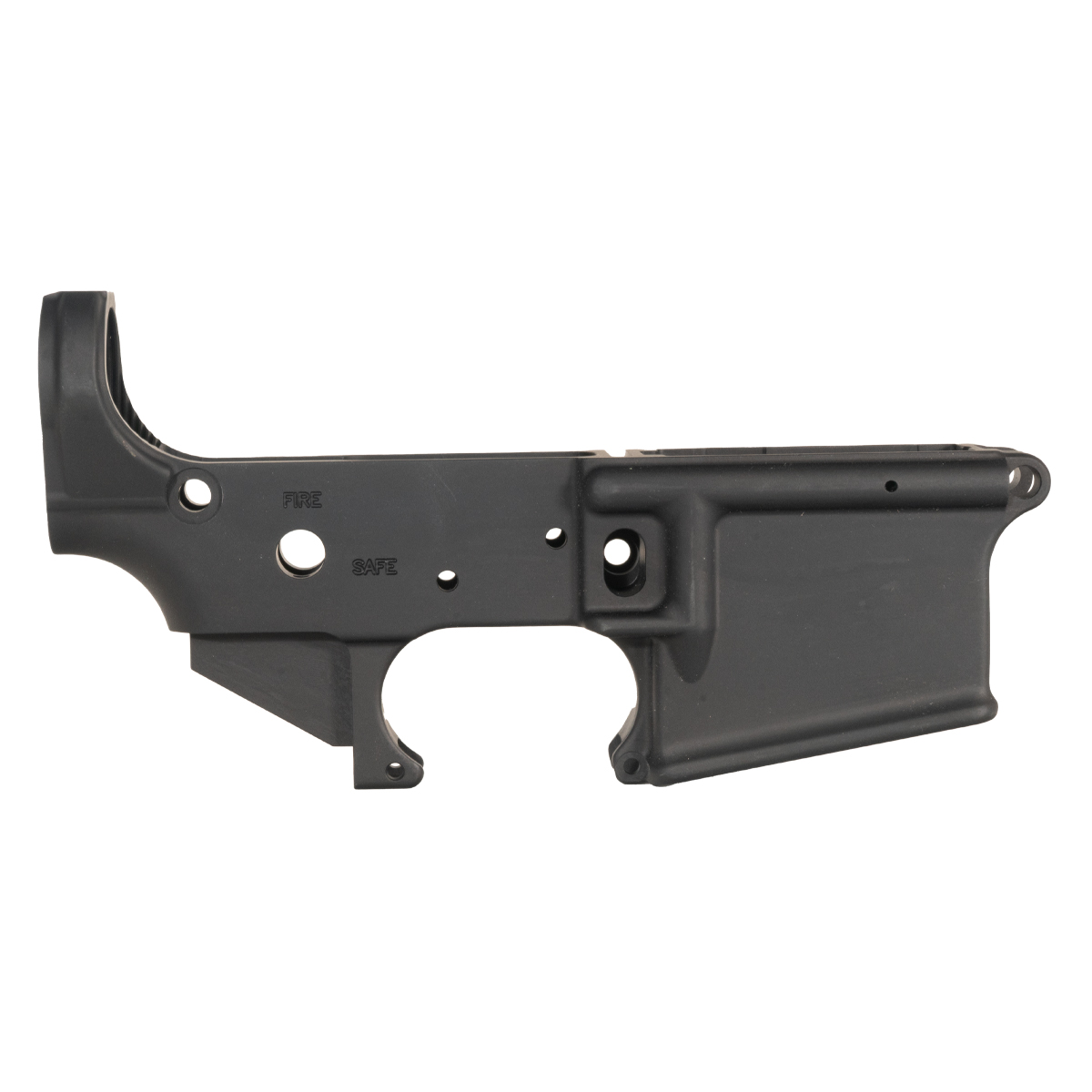 The Blemished Spike's Tactical Stripped Lower Receiver with Safe/Fire Text is a high-quality Mil-Spec component designed for AR-15 platforms. Crafted from 7075-T6 forged aluminum, this receiver is lightweight yet durable, making it an ideal choice for firearm enthusiasts. The Safe/Fire selector is clearly marked, allowing for straightforward operation.