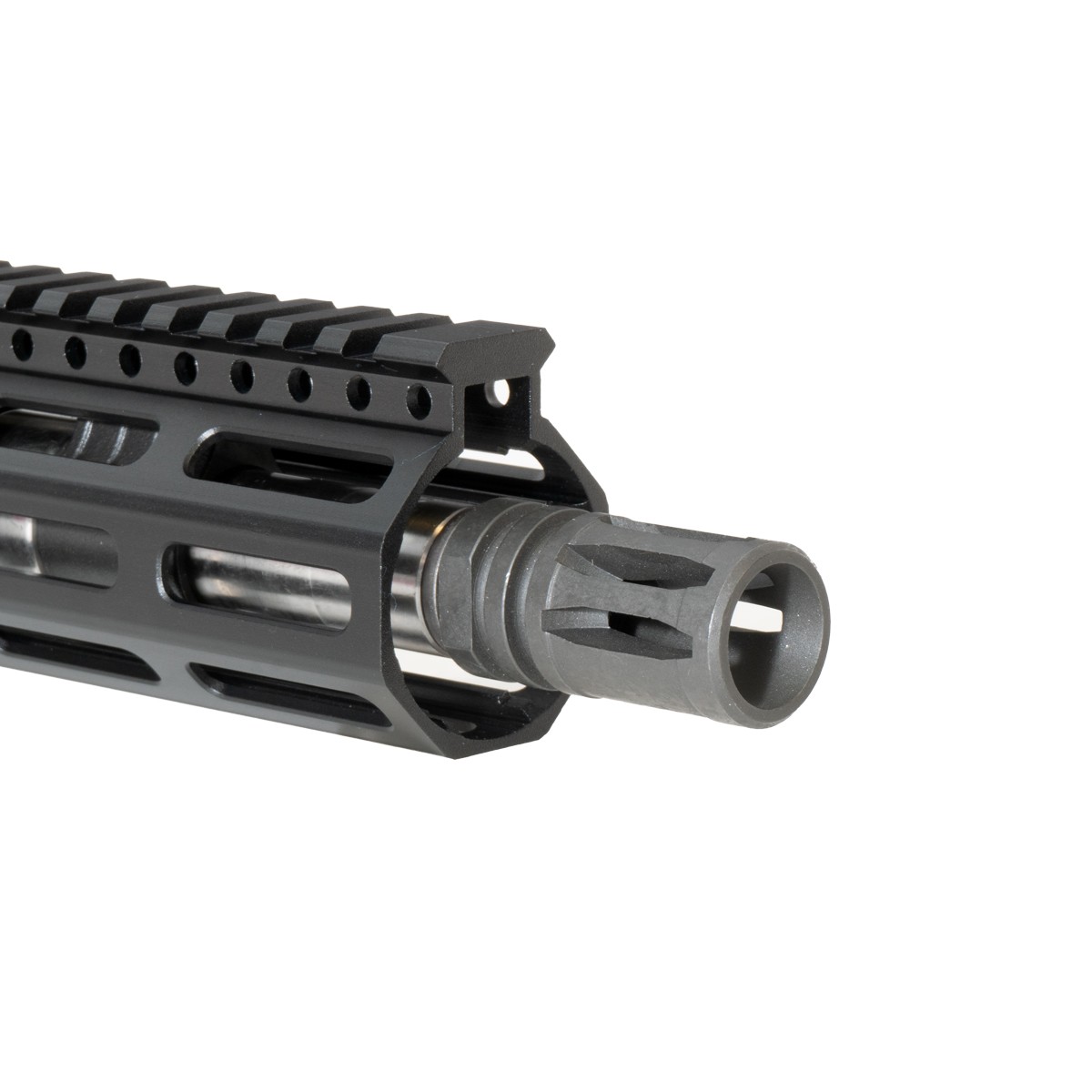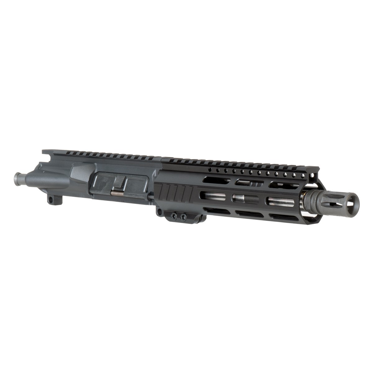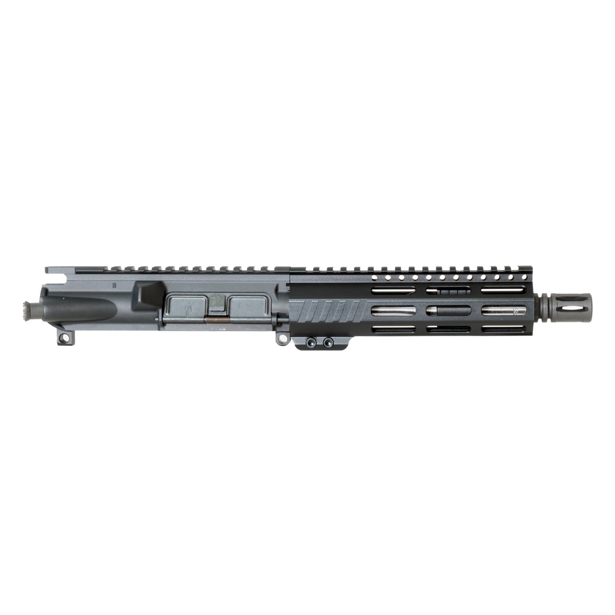 The Aegis 7.5-inch Pistol-Gas 1:7 .223 Wylde AR-15 Freefloat M-Lok Handguard Pistol Upper Build Kit from Davidson Defense features a 7075-T6 aluminum upper receiver with an anodized finish, ensuring durability and resistance to wear. The 7.5-inch 4150 Chrome Moly Vanadium barrel is treated with a phosphate finish and has a 1:7 twist rate, suitable for stabilizing a variety of .223 Wylde ammunition. It operates with a pistol-length gas system and includes a 0.75-inch gas block, promoting reliable cycling. A freefloat M-Lok handguard made from 6061-T6 aluminum provides versatility for mounting accessories without adding unnecessary weight. The upper also comes with a TPI GI Birdcage flash hider, contributing to overall performance