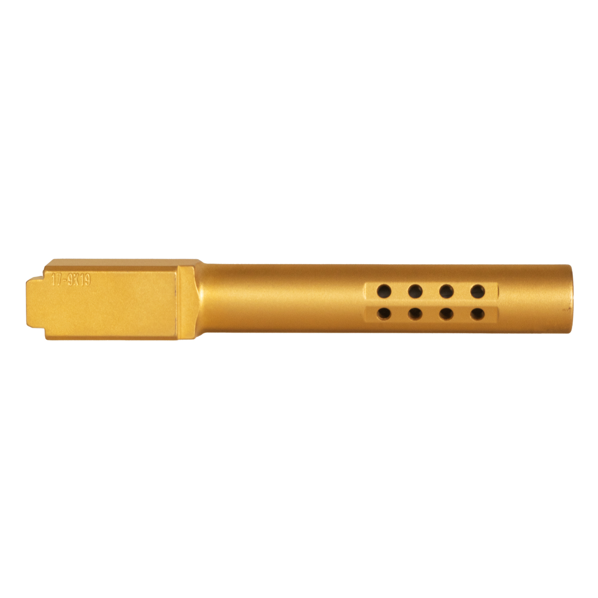 The Davidson Defense Crown-Cut Ported Gold Titanium Nitride Barrel is specifically compatible with Glock 17 Gen 1-3 models, crafted for optimal performance and precision. Chambered for 9mm (9x19), this barrel features a non-threaded design that caters to competitive shooting requirements. The crown-cut porting minimizes muzzle rise, allowing for faster follow-up shots and improved accuracy.