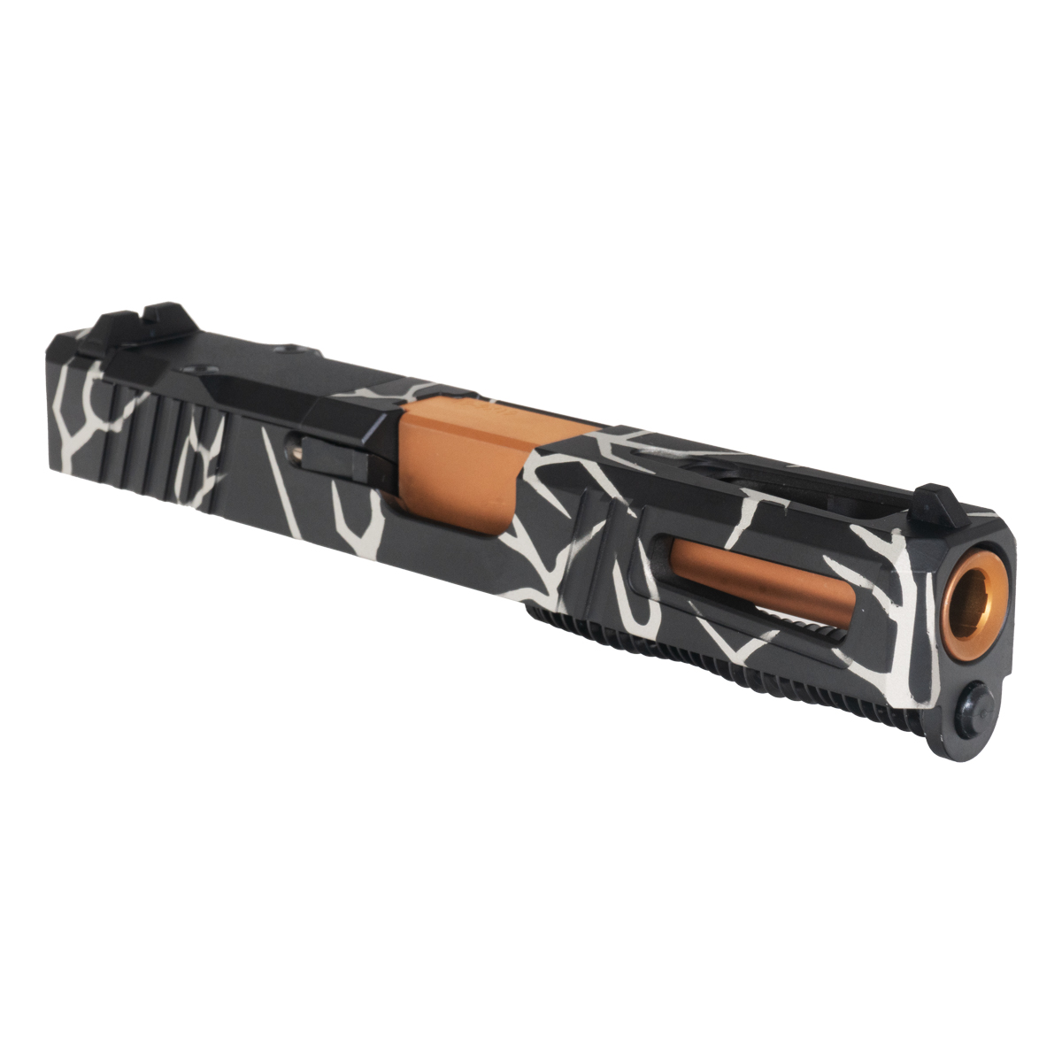 The DTT Stiffler MFG Lionheart Ported Copper PVD Barrel G19 Gen 1-3 Compatible Complete Slide Kit is engineered for the discerning shooter seeking reliability and performance. This kit features a stainless steel construction with a striking Stainless Lightning finish in a combination of shimmer and black Cerakote. The slide is designed for G19 generations 1 through 3, offering full compatibility and functionality. Equipped with an RMR optic cut and an aluminum plate cover, this slide kit supports modern optics for precision aiming.