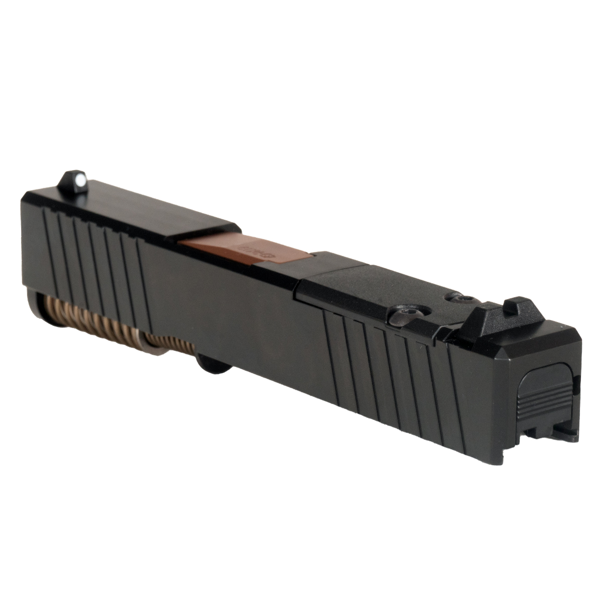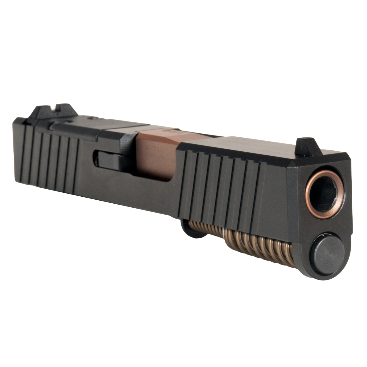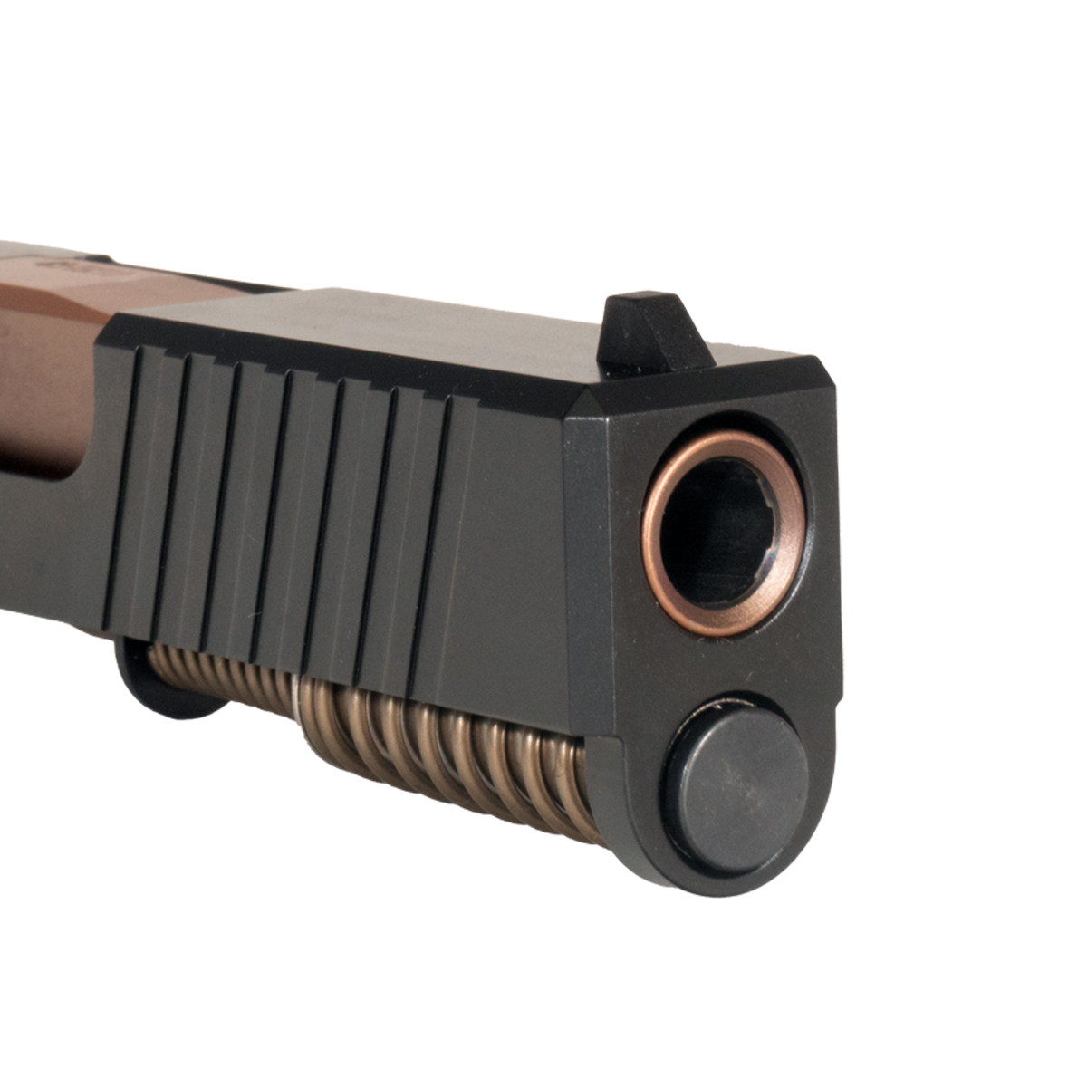 The Sentinel Copper PVD Barrel G43 Compatible 9MM Black RMSc Complete Slide Kit from Davidson Defense is a precise aftermarket solution for G43X enthusiasts. This complete slide kit features a durable slide finished in black nitride, providing corrosion resistance and a sleek look. Designed for optimal functionality, it includes front and rear serrations for improved grip during operation.