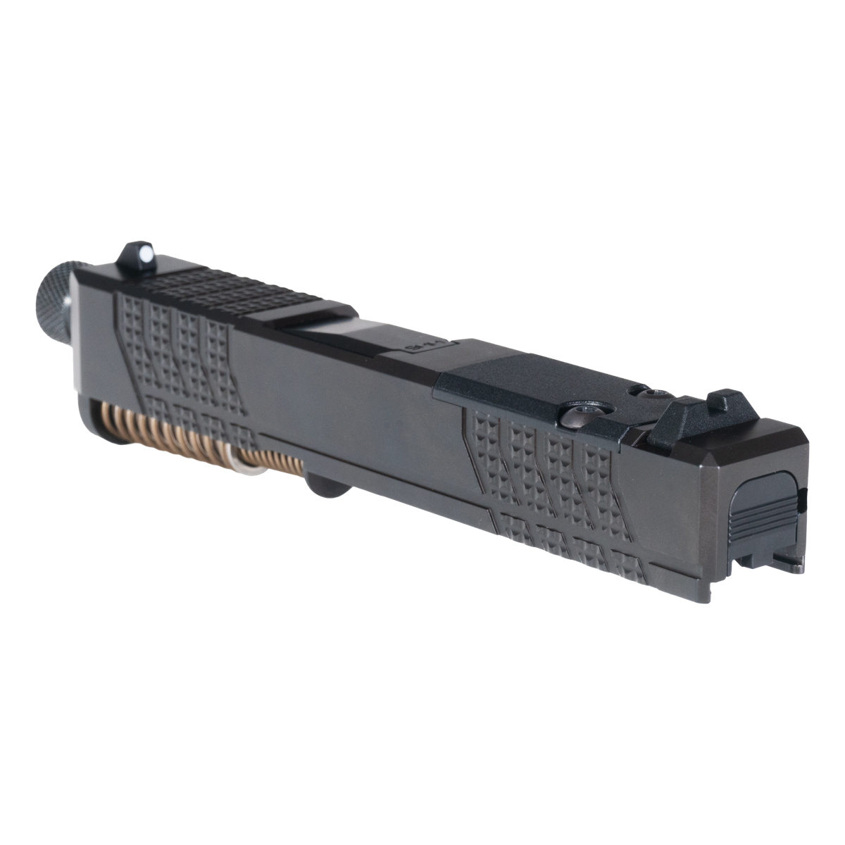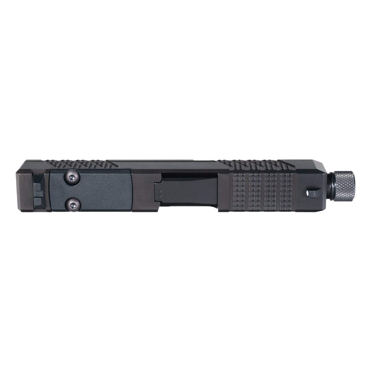 416 Stainless Steel Slide Construction: The complete slide is constructed from 416 stainless steel with black finish, offering robust durability and corrosion resistance for demanding applications. Aggressive knurled serrations provide enhanced grip for press checks, slide manipulation, and one-handed operation in adverse conditions. The precision machining ensures tight tolerances for reliable cycling and consistent lockup, while the sleek profile maintains the compact dimensions essential for concealed carry applications.