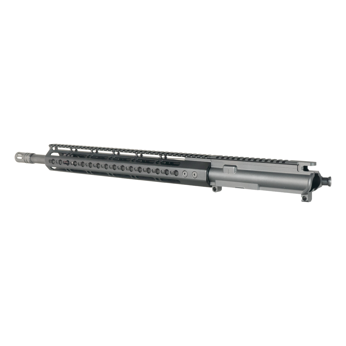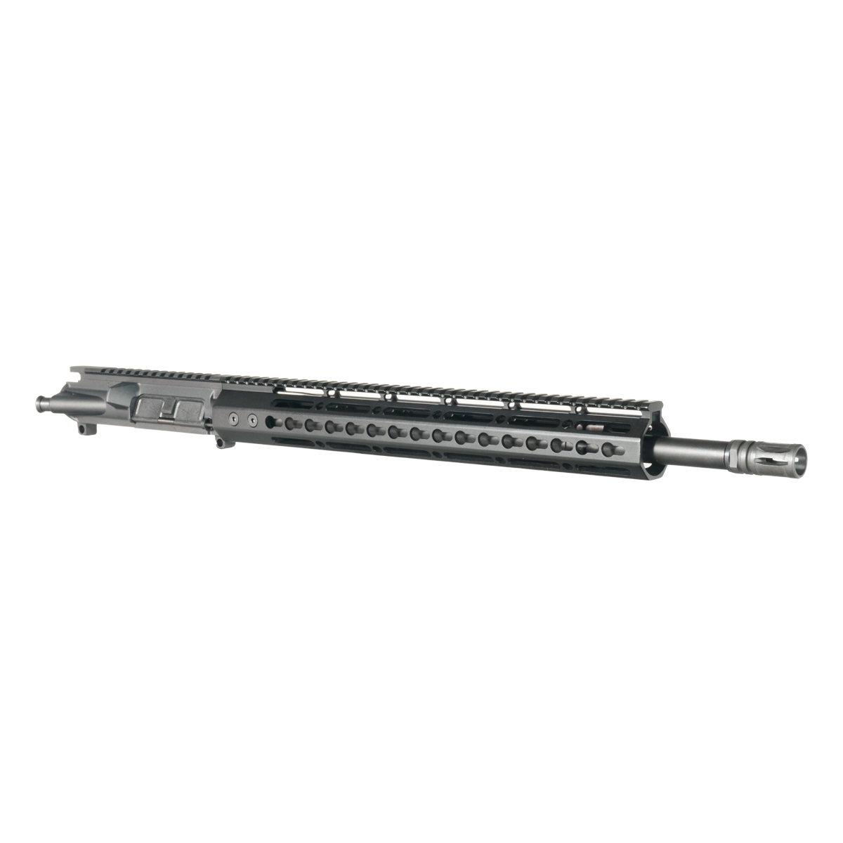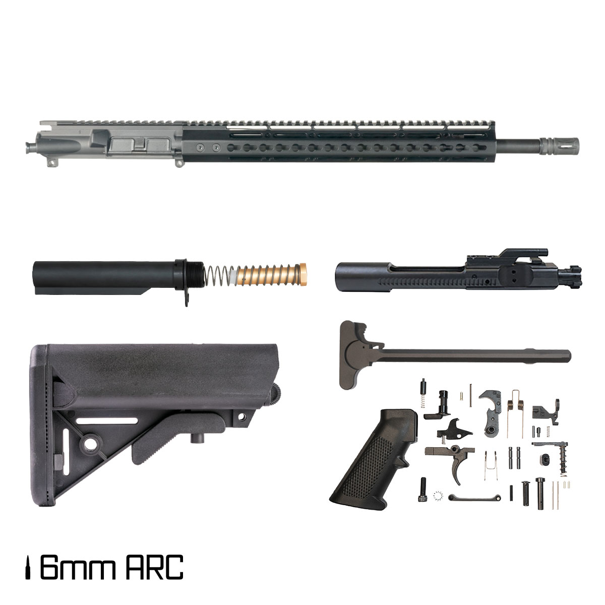 18 inch 4150 CrMoV barrel in 6MM ARC with 1:7.5 twist rate, nitride finish, rifle length gas system, 15 inch freefloat Keymod handguard, 7075-T6 aluminum upper receiver with M4 feed ramps, nitride finished 8620 steel bolt carrier group, mil-spec M4 charging handle, 6-position buffer tube, carbine buffer and spring, collapsible stock, and GI birdcage flash hider. This full build kit delivers everything needed for a precision oriented 6MM ARC rifle build except the lower receiver.