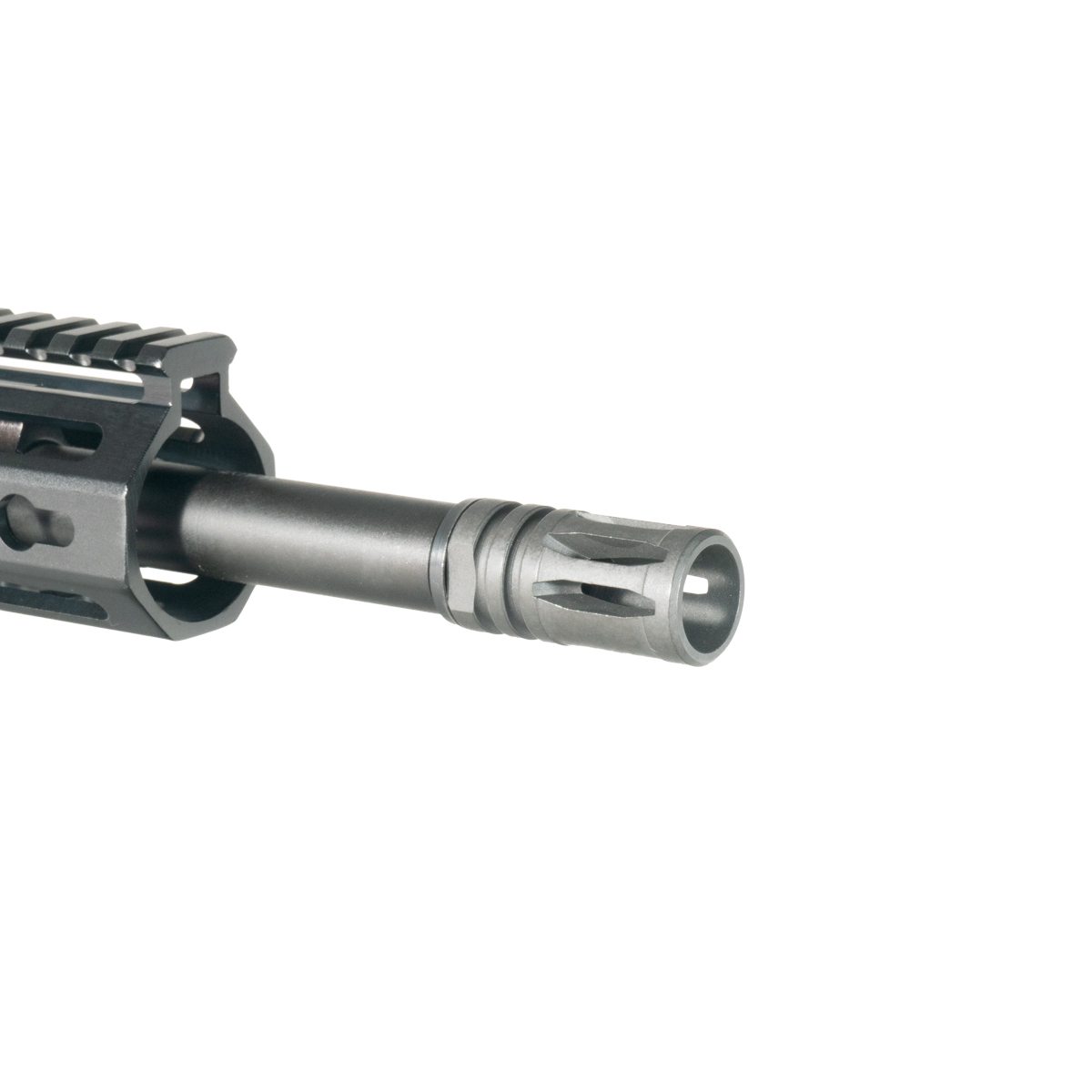 - 5/8x24 threaded muzzle with GI birdcage flash hider compatible with suppressors and muzzle devices using 5/8x24 threads