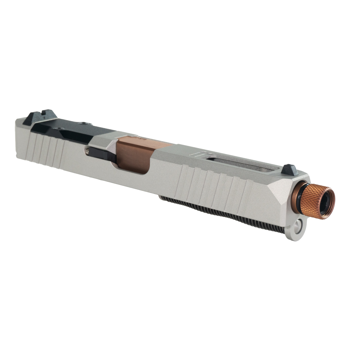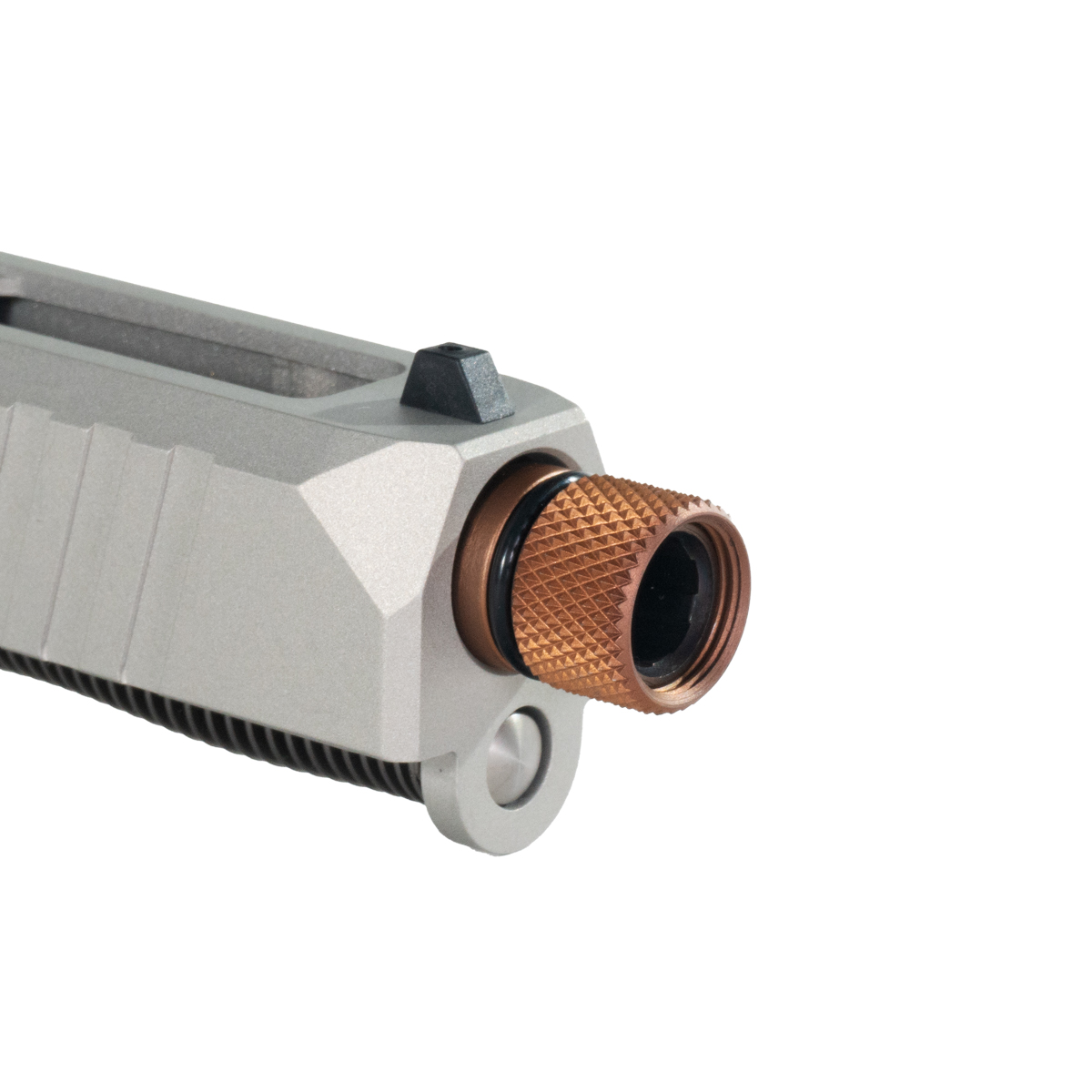 Accompanying the slide is a 416R stainless steel barrel finished in Copper PVD, providing superior durability and performance. The barrel features a 1/2x28 thread pitch and comes with a threaded muzzle device, complete with an O-ring for secure fitment and a sleek Copper finish. Designed for reliability and precision, this complete slide kit is essential for gunsmiths seeking quality components for G17 modifications.
